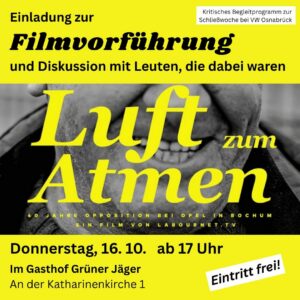 Einladung zur Filmvorführung der Dokumentation “Luft zum Atmen” anlässlich der Schließwoche bei VW Osnabrück.